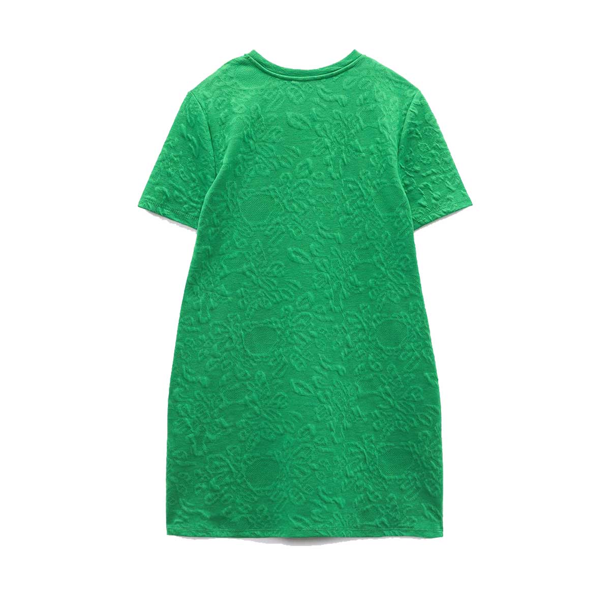 ショートワンピース、ラウンドネック、ショートスリーブ、フロントフェイクウェルトポケット、テクスチャーファブリックディテール